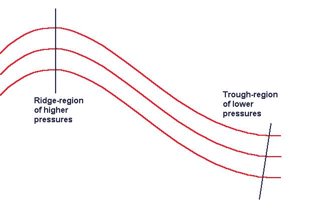 | The area under a ridge in the jet stream usually experiences warm temperatures and clear skies. The area above a trough in the jet stream usually experiences colder temperatures, more cloudiness, and is generally more favorable for precipitation. |