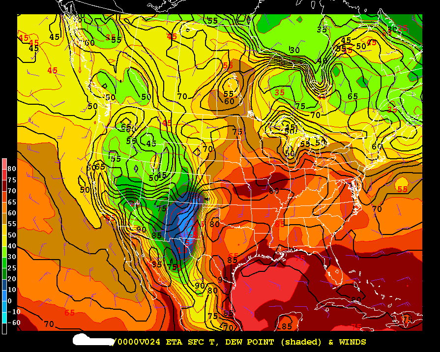 24h NAM prediction of surface T/Td - valid 00 Z
