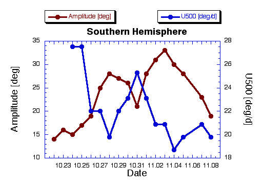 Make a plot of wave speed versus U(500 hPa) where both are in [deg/d]. Here is an example. Does Rossby wave theory help us here? (Think about the dispersion relationship we derived for phase speed.) Compute the overall average of the U(500 hPa) you recorded. Is the wave speed larger or smaller than the U(500 hPa) on average? Does this make sense in terms of Rossby wave theory?