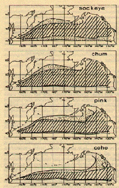 Inferred February distribution of sockeye, chum, pink and coho salmon in the North Pacific: