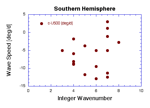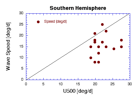 Make a plot of wave speed versus U(500 hPa) where both are in [deg/d]. Here is an example. Does Rossby wave theory help us here? (Think about the dispersion relationship we derived for phase speed.) Compute the overall average of the U(500 hPa) you recorded. Is the wave speed larger or smaller than the U(500 hPa) on average? Does this make sense in terms of Rossby wave theory?