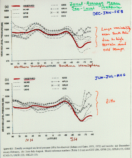 Zonally-averaged JJA and DJF sea-level pressure simulated by current high resolution GCMs. Adapted from Figure B27 IPCC, 1990.