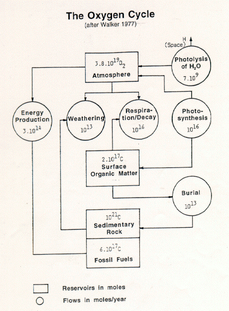 Another way of getting an overview of the different forms and transformations of oxygen is to look at the oxygen cycle (Figure 12). In future summary informations we will examine cycles of other molecules, but the oxygen cycle is one of the most interesting. Circles in the accompanying figure represent present estimates of flows, and boxes represent present estimates of reservoirs. The atmosphere itself is a large reservoir, 1019 moles, but an even larger reservoir exists in sedimentary rocks. Oxygen may be chemically combined in these reservoirs whereas in the atmosphere it's free. The reservoir of oxygen in fossil fuels is about 3 times larger than that of the biosphere, which consists of plants and animals - both living and dead - at the Earth's surface.