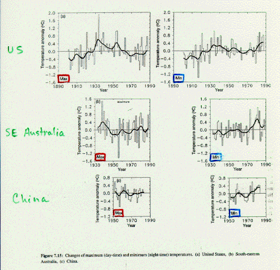 If we look separately at daily maximum and daily minimum temperatures, Figure 2, we find that a rise in daily minimum temperatures is accounting for most of the warming that has been observed, at least in the US and certain parts of the world. This could be attributed to both rise in greenhouse gases and increases in cloudiness, which will have a larger influence on nighttime minimum temperatures than daytime maximum values.