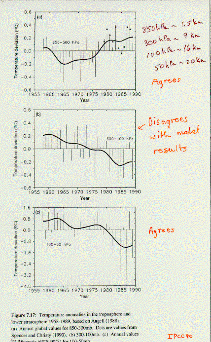 since about 1965 of about 0.4°C. The upper troposphere (300mb - 100 mb) shows a cooling