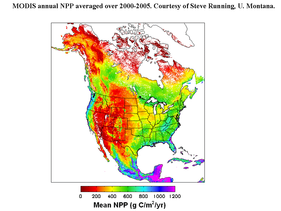 MODIS annual NPP averaged over 2000-2005. Courtesy of Steve Running, U. Montana.