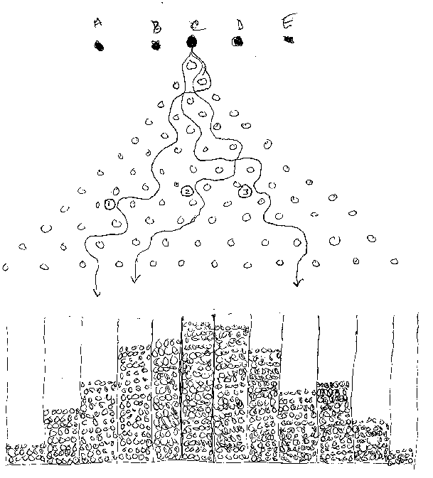 Para entender el concepto de modelo climático y aclarar el concepto de predicción climática comparado con pronostico del tiempo, vamos a considerar la analogía con los juegos "flipper" o "pinball". Esto no constituye un modelo real para simular el clima, sino que es solo una analogía para ayudarnos a distinguir tiempo de clima y observar como cambian las estadísticas climáticas, al cambiar algunas condiciones. La siguiente figura muestra el resultado de muchos lanzamientos de bolas a través de la matriz de clavijas. Cuanto mayor sea el numero de clavijas, mayor será el numero de trayectorias de las bolas para llegar a la base. La posición exacta de las clavijas determina la ubicación de las bolas en los distintos casilleros de la base. Por lo tanto, un pequeño cambio en la posición de las clavijas tendrá alguna influencia en la distribución de las posibles trayectorias, influyendo algunas clavijas mas que otras. |