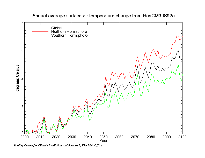 Figure 12 - Modelled global mean temperature time-series for HadCM2CON, HadCM2GHG and HadCM2SUL