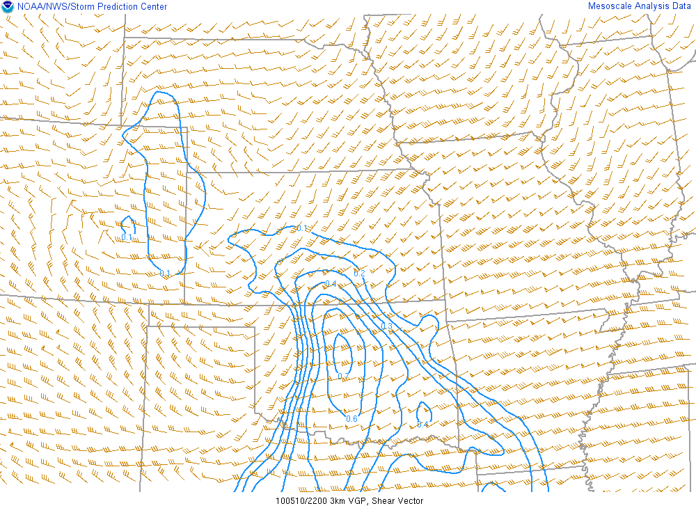 KVNX close call: This image PDF shows four panels of storm relative velocity from KVNX with times indicated. The storm motion vector used was about 250° and 40 kts. The first two show insane storm relative inflow winds of 70 - 80 knots at an elevation of only 100 - 300 feet above the radar horizontal! The actual velocities were about 35 - 45 kts, and these winds probably made it to the ground, so imagine the inflow chasers in the area probably experienced. The second pair shows the well formed and well resolved mesocyclonic/tornadic circulation. The image at 2102 UTC shows several consecutive range gates with gate-to-gate shear of 116 - 141 kts! If that wasn't impessive enough, check out the image below.