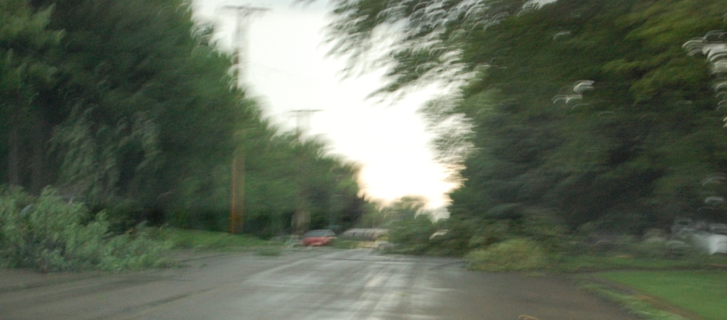 It was very difficult to determine what this feature was. It hung so low it was very tempting to call it a funnel cloud. However, the movement and evolution of this feature did not lend credence to that assumption. I think this was probably some sort of tilted cloud column. We were looking at it at such an angle as though it appeared to be tilted straight up and down. It was likely outflow related, and not tornadic. This event helped us decide where to go: we turned east on 40th St, drove east a few miles, then sat for a few minutes just to the west of this feature, and right under the edge of a new updraft. It was going up behind the merged storm and nearly directly over our heads.