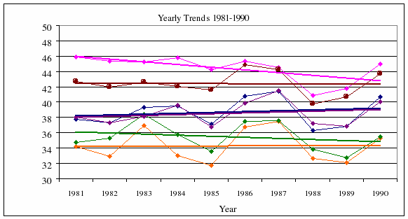 1981-1990 yearly means and linear fits for Des Moines, St. Louis,