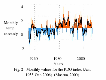 Again, there is a switch from a negative to a positive trend occurring somewhere in the late seventies. This switch may be related to the Pacific Decadal Oscillation (PDO). There is argument that the trends since the seventies are occurring as a result of a superposition of a wet phase of the PDO in addition to the global increasing trend. A “cool” PDO regime was apparent from 1947-1976, where it then switches between 1976 and 1977 to a more “warm regime” as seen in Fig. 2 (Mantua, 2000).