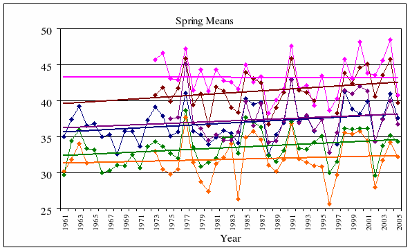 A2. Spring, yearly means and linear fits for Des Moines, St. Louis,
