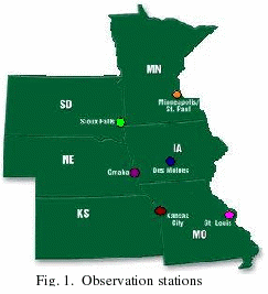 Surface dew point hourly observations were obtained through the Iowa Environmental Mesonet (IEM, 2006) from the National Climate Data Center for six stations throughout the Midwest: Des Moines (DSM), Kansas City (MCI), Minneapolis (MSP), Omaha (OMA), Sioux Falls (FSD), and St. Louis (STL) (Fig. 1). The data were extracted via a Python script that computed monthly averages for each year.