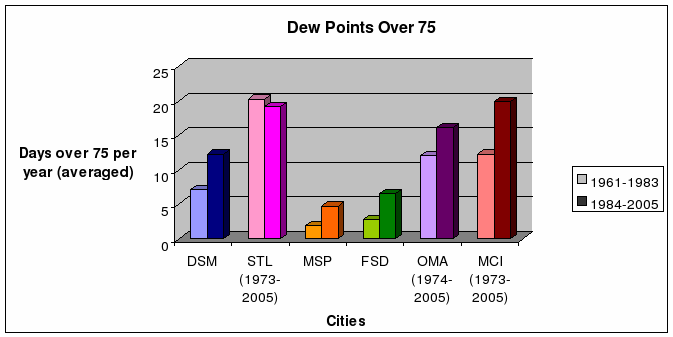 This shows that not only are dew points in general increasing, but days with extremely high dew points are becoming more numerous also. It is noteworthy that the number of days with extreme dew points showed closer correlation between the two periods in St. Louis, Omaha and Kansas City, where data was only available from 1974, which could show that the number of extreme dates was higher at the end of the first period.